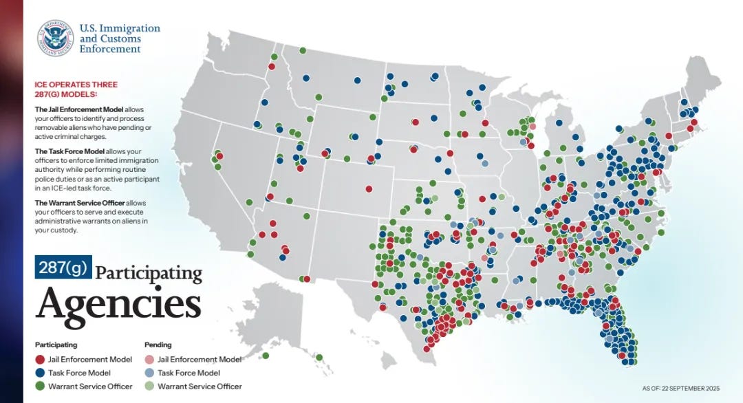 Some of the most dangerous things ever done to democracy don’t come from coups or soldiers. They come from legal clauses written to look harmless, but in actuality, they close the seal on authoritarianism. Section 287(g) of the Immigration and Nationality Act is one of them, a line of text that lets ICE hand over federal immigration powers to local police. It’s an agreement that turns sheriffs into deportation officers, and it’s how a national machine of fear runs through county jails, small-town stations, and traffic stops across America. Currently, over 1000 local police forces have signed up to work for ICE, over 1000 forces that have ditched their own communities for the Trump regime’s secret police.